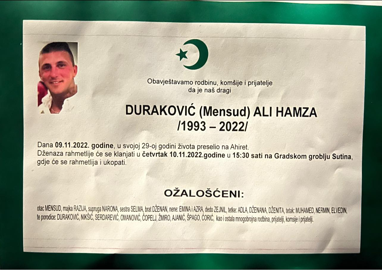 Obavjestavam rodbinu i prijatelje da nas je napustio moj brat Ali Hamza Durakovic. Dzenaza ce se obaviti u cetvrtak 10.11.2022 u 15:30 u gradskom groblju Sutina!