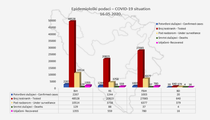 U Bosni i Hercegovini je do danas u 12.00 sati 2.267 potvrđenih slučajeva zaraze koronavirusom, 1.355 je oporavljenih osoba, te 129 smrtnih slučajeva.