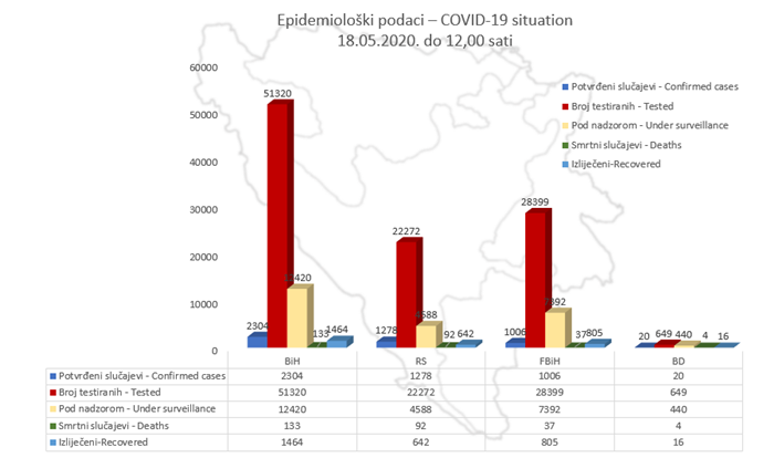 U Bosni i Hercegovini do danas su registrovana 2.304 potvrđena slučaja zaraze koronavirusom od ukupno 51.320 testiranih.