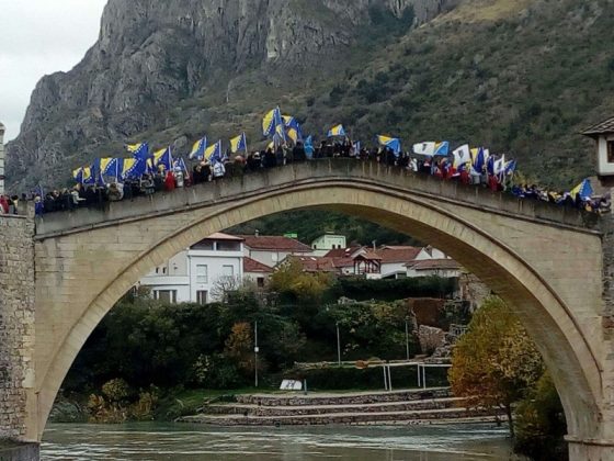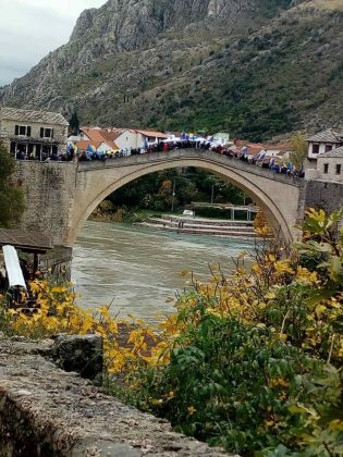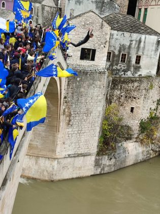 Građani Mostara danas su, zajedno sa mostarskim učenicima, profesorima, i direktorima osnovnih i srednjih škola grada Mostara obilježili datum rušenja Starog mosta “skokom bez aplauza” i bacanjem cvijeća u rijeku Neretvu.