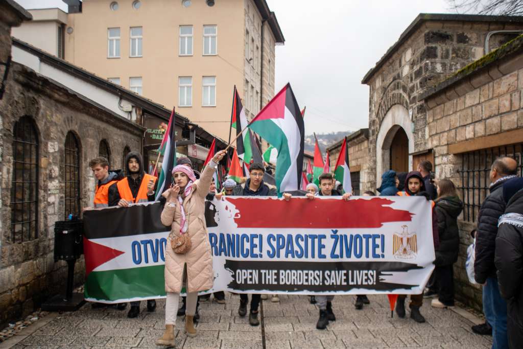 Učesnici skupa, većinom mladi, nosili su zastave Palestine i Bosne i Hercegovine te transparente s natpisima “Oni koji podržavaju genocid isti su kao i oni koji ga čine”, “Sa ubicama djece i nevinih se ne razgovara” i “Palestino, nisi sama, uvijek Bosna je sa vama” i druge.
