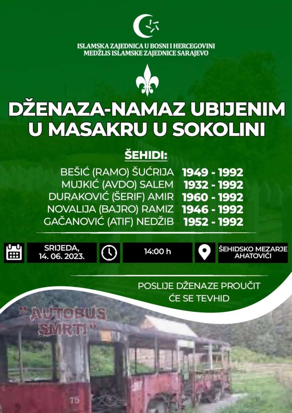Na Šehidskom mezarju Ahatovići u srijedu, 14. juna, s početkom u 14.00 sati, bit će organizirana dženaza za pet stanovnika Ahatovića ubijenih 14. juna 1992. godine u masakru u Sokolinama, javlja MINA.