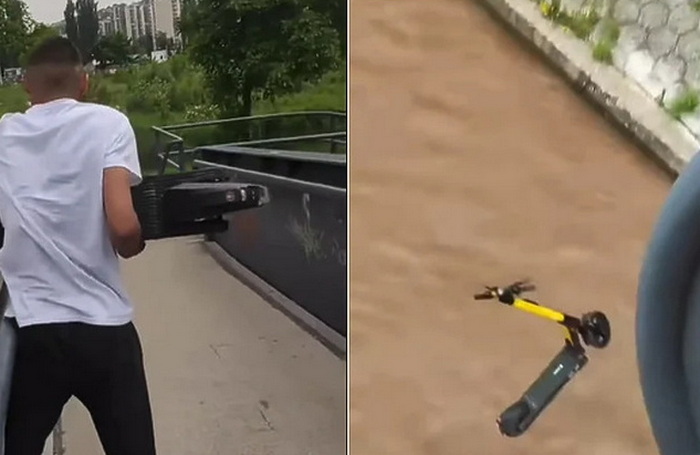 Na videosnimku se može vidjeti kako mladić u sarajevskom naselju Otoka podiže električni romobil i baca ga preko ograde mosta u rijeku Miljacku.