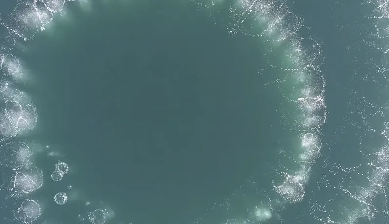 Ono što izgleda kao savršen krug pojedinačnih mjehurića zatim se pretvara u više krugova unutar ogromnog područja. Iako izgleda prilično impresivno, ono što slijedi nakon mjehurića natjeralo bi svaku razumnu osobu da pliva kao da joj život ovisi o tome.