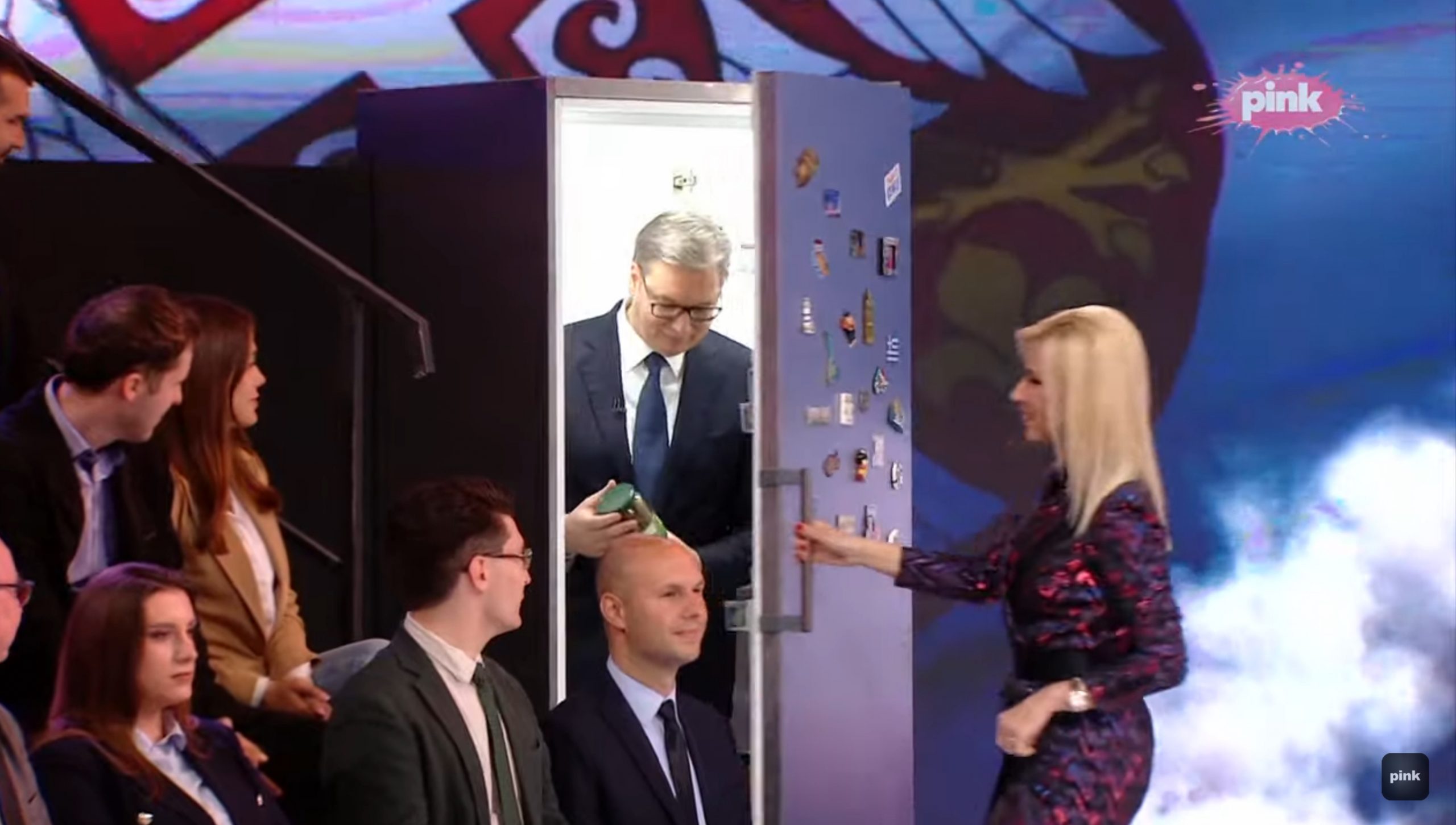Predsjednik Srbije Aleksandar Vučić večeras gostuje na TV Pink sa svojim saradnicima, a u studio je ušao iz frižidera.
