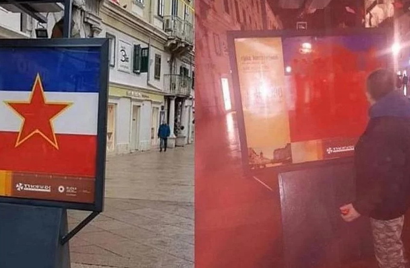 Ilustracija zastave SFR Jugoslavije postavljena je sklopu instalacije “Rijeka, koraci i vrijeme” na Korzu, a u petak ju je muškarac, kojeg je policija kasnije privela, prebojio crvenom bojom.