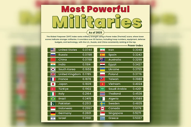 Global Firepower Index za 2025. godinu je najrelevantnije rangiranje najjačih vojnih sila svijeta. U njegovim detaljima kriju neka vrlo zanimljiva pomjeranja, geopolitičke poruke i signali promjena u svjetskom poretku.
